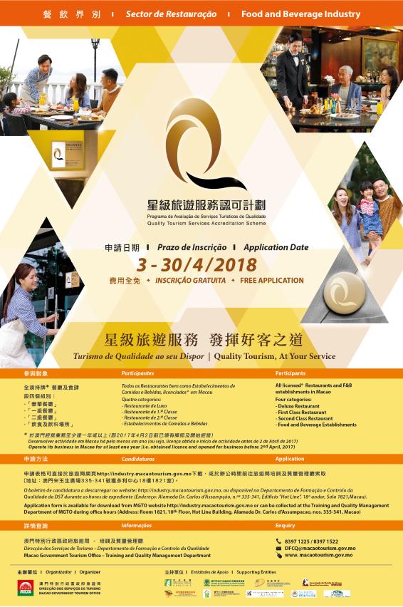 今年度“星级旅游服务认可计划”餐饮界别和旅行社界别的参加名额分别为80个及30个,全澳门持牌旅行社总行或分社以及持牌餐厅食肆,于澳门经营业务至少达一年或以上均可申请参加。申请表格可于旅游局索取或透过澳门旅游业界网站http://industry.macaotourism.gov.mo下载。符合申请资格并有意参加的商户,可于4月3至30日期间办公时间内向旅游局递交申请表格及相关文件。