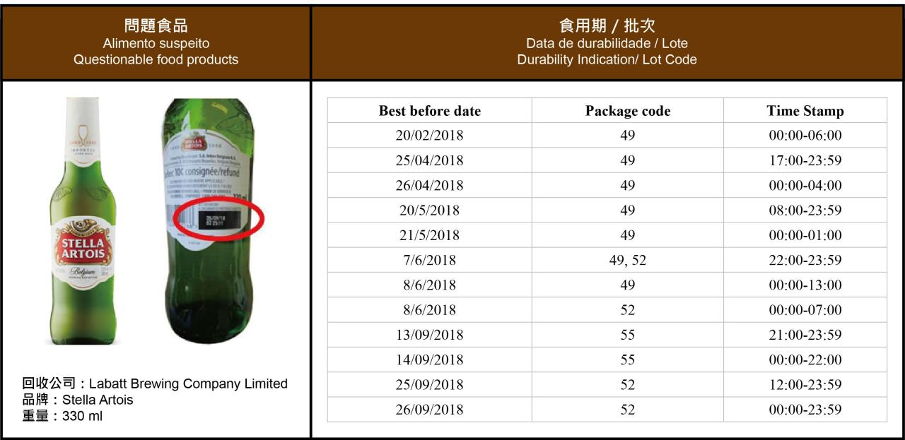 民署食安中心透过恒常食品事故监察系统,获悉Labatt Brewing Company Limited回收可能含有玻璃碎片的啤酒产品。涉及回收的产品名称“Stella Artois”,容量330毫升。根据现阶段资料,涉事产品共有十二批次,包括: