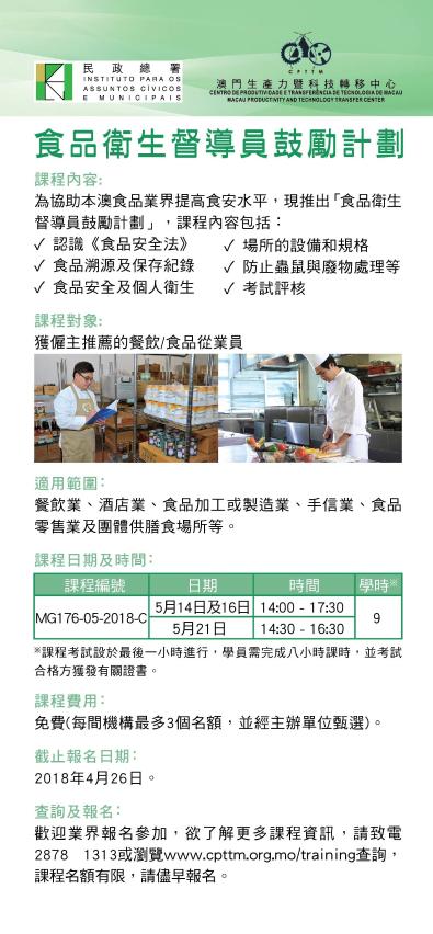 五月份课程开始接受报名,报名日期至四月二十六日,欢迎有兴趣的食品业界参加。有关课程信息或报名详情可浏览澳门生产力暨科技转移中心网站www.cpttm.org.mo/training、民署食品安全信息网www.foodsafety.gov.mo,或可致电2878 1313查询。