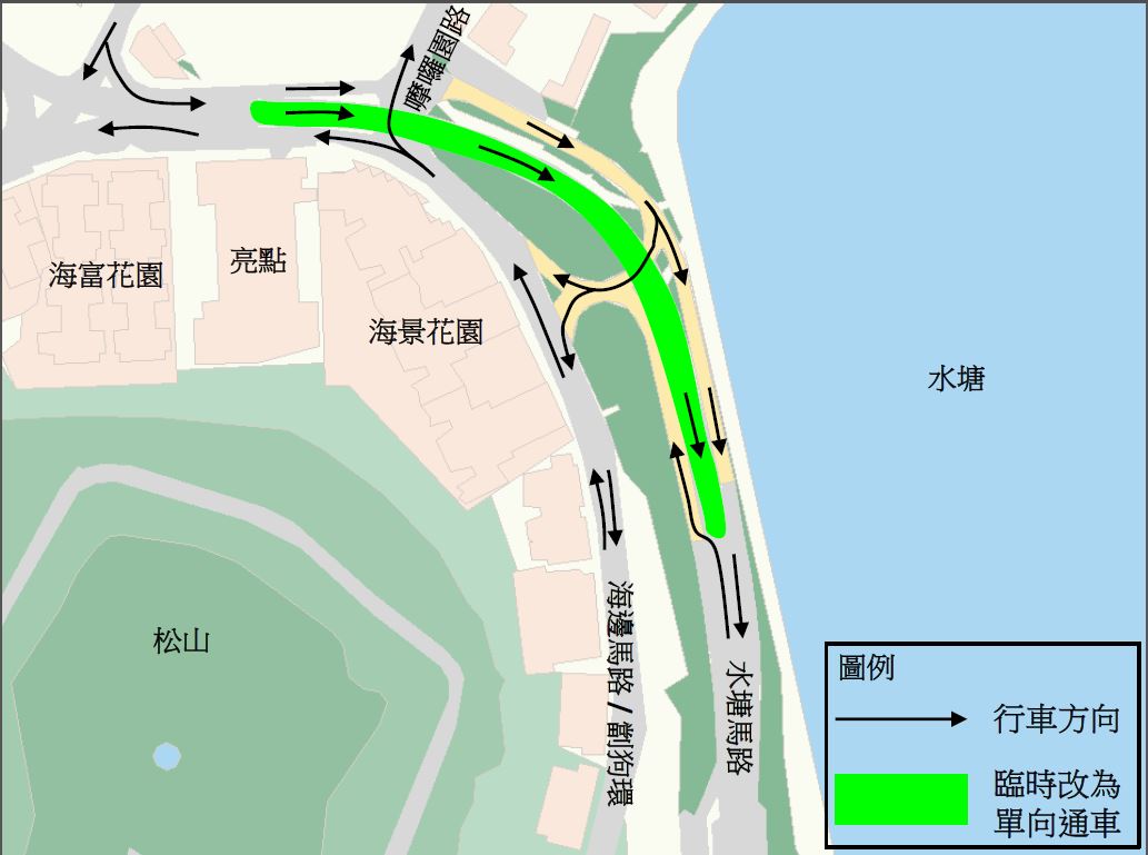 接近嚤啰园路、往罗理基博士大马路方向的一段水塘马路,在警方协助下临时改为单向行车,驾驶者若要前往士多鸟拜斯大马路可取道水塘马路行车天桥 |