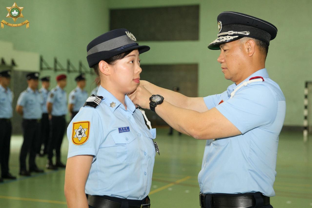 今天(23日)上午,在治安警察局特警队大楼内进行首席警员晋升仪式。仪式由治安警察局局长梁文昌警务总监、副局长黄子晖副警务总监及副局长刘运嫦副警务总监主持。出席仪式的还有各部门的主管,为同僚晋升作出祝贺。