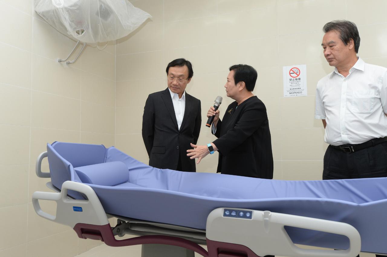 在卫生局人员的陪同下,谭俊荣视察九澳康复医院设施。九澳康复医院共有160张床位,包括康复病房、纾缓病房及物理治疗区,三个主要功能部门设于同一大楼内,产生协同效应,成为完善康复医疗服务网重要的一环。目前,卫生局基本完成筹备工作,待下水道工程完成后,就可启用九澳康复医院。