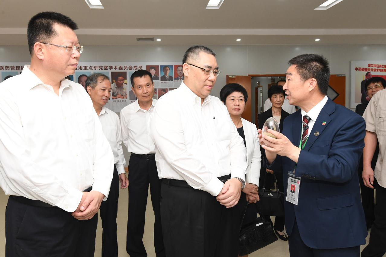 在中山市市长焦兰生陪同下,行政长官、特区政府代表团及“千人汇”汇员的代表考察了中智药业集团,期间,听取了集团总经理成金乐有关企业现况及发展规划的介绍,澳门科技大学校长刘良也报告了该校与中智药业集团共建科技大学中药品质研究国家重点实验室的工作。