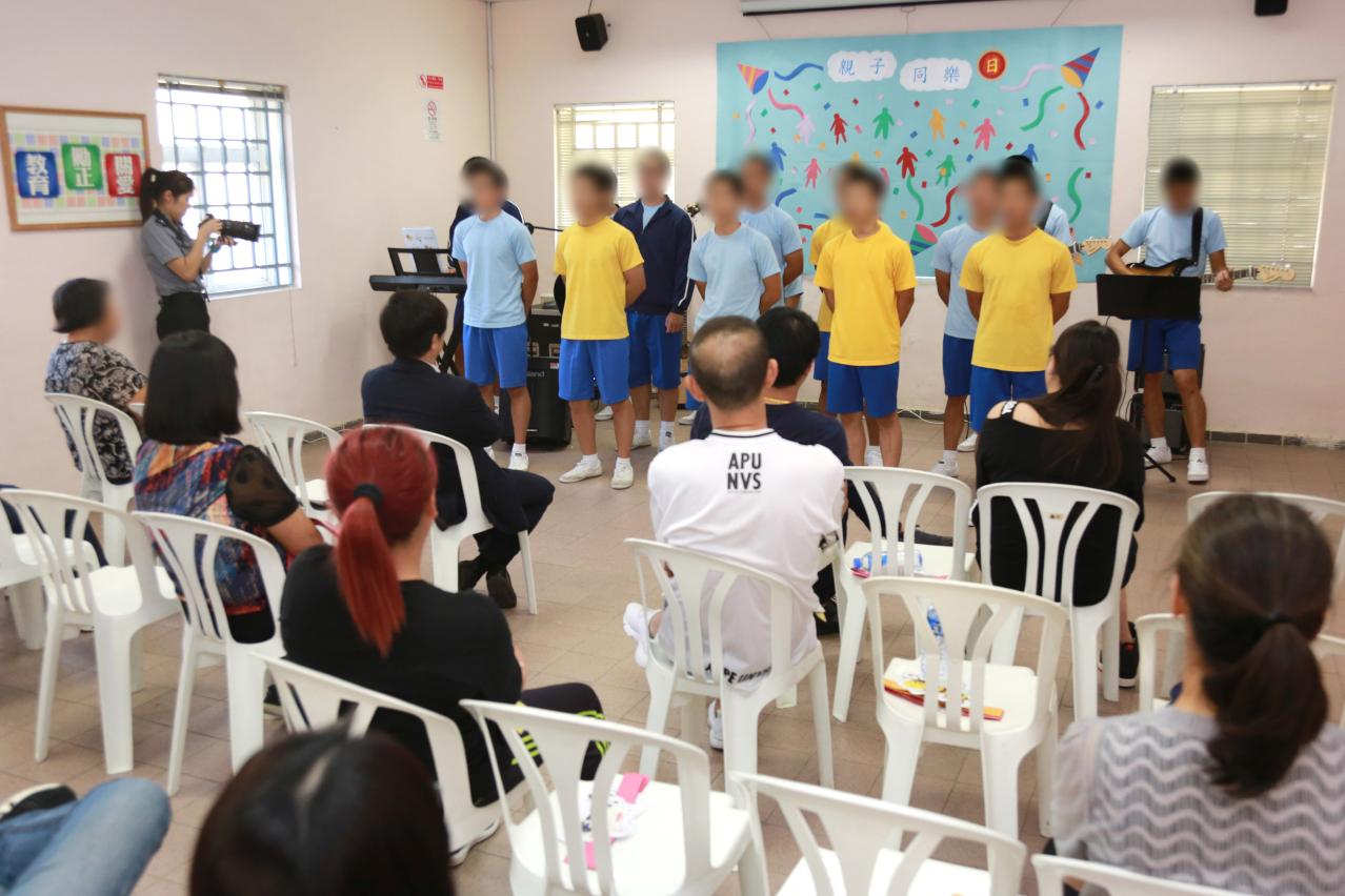 除参观院内设施外,院方还安排一系列亲子互动游戏,其中在制作亲子手指画中,院生主动牵着家人的手,细心教导他们如何以手指打印的方式于画纸的树干上,印上色彩缤纷的树叶和花朵,每个家庭都创作出与别不同的手指画,现场气氛乐也融融。院方冀是次活动能带出“爱”的信息,让院生和家人打开心扉和消除隔膜,拉近亲子间的距离,同时让院生感受家人的关爱,创建自信,积极改正昔日过错,及早与至亲团聚。最后,全体院生高声合唱《海阔天空》,台下家人均一起跟随节奏拍掌,细声哼唱。