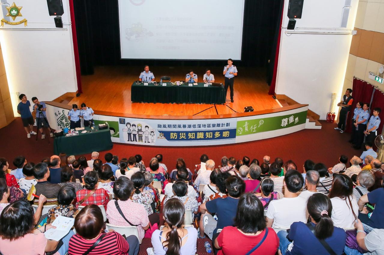 治安警察局于7月3日联同社会工作局,在中葡职业技术学校举行“防灾知识知多啲”讲座,并邀请到街总青洲坊会互助会陈凤副理事长、工联北区综合服务中心赵兰瑛主任等130多位社区代表出席,由治安警察局代表李德辉警司、蒋少鑫警司与林锦豪警长介绍“台风期间风暴潮低洼地区疏散撤离计划”的安排,台风来临前的防灾准备、应急包的准备、提早准备好用水、粮食、应急药物、生活用品、做好防风措施、密切留意撤离广播、遵照民防架构发出的指示和呼吁、尽早远离低洼地区、如何选择合适的路径及时疏散到安全的地方暂避等实用信息作详细介绍;社会工作局代表龙伟雄先生讲解避险中心的概念、介绍位于澳门半岛及离岛区的各个避险中心与集合点的位置、避险中心内的设备和物资等,并实地介绍作为避险中心之一的中葡职中体育馆。