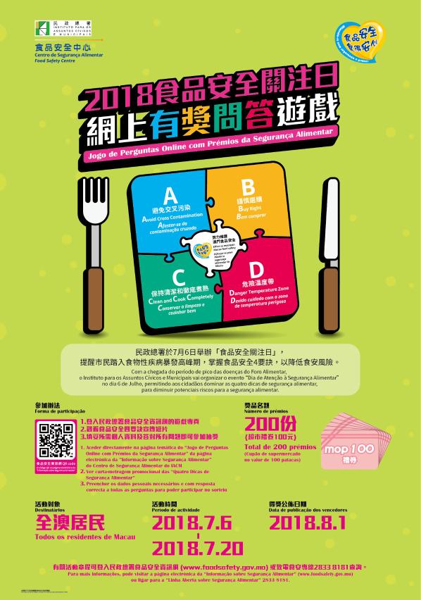 民署将于七月六日至二十日期间推出“食品安全4要诀ABCD”网上有奖问答游戏,参加者只要登入食品安全信息网内的游戏专页,观看教育短片并正确回答六条问题,将有机会赢取价值澳门币壹佰圆超市礼券,获奖名额共二百名,欢迎市民踊跃参与,得奖名单将于八月一日公布。“食品安全4要诀ABCD”是民署编辑的一套多语文版本在线教材,内容围绕避免交叉污染(Avoid Cross Contamination)、谨慎选购(Buy Right)、保持清洁和彻底煮熟(Clean and Cook Completely)、危险温度带(Danger Temperature Zone),鼓励不同语言及文化背景人士学习,并运用在日常烹调制作食物之中,有效预防食源性疾病的发生。
