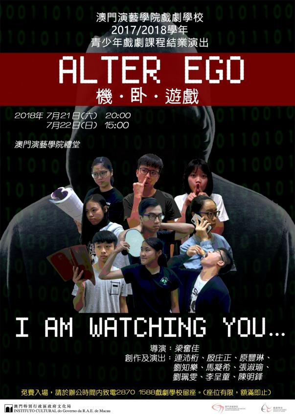 青少年戏剧课程结业演出《机・卧・游戏 Alter Ego》于七月二十一日(星期六)晚上八时及二十二日(星期日)下午三时于澳门演艺学院礼堂(澳门高士德大马路14至16号)举行,免费入场,座位有限,先到先得。留座请于办公时间内致电二八七零一五八八。