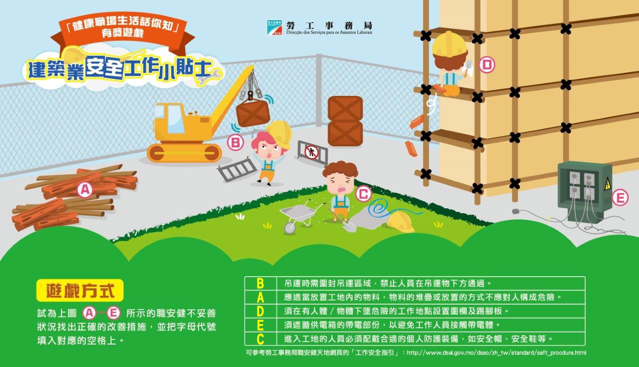 是次游戏的正确答案和得奖名单已上载至劳工局网站 https://www3.dsal.gov.mo/safetytips/,欢迎参阅。得奖者可于7月11日至8月10日办公时间内,携同有效澳门居民身份证前往劳工局职业安全健康厅服务柜台(地址:澳门马揸度博士大马路221-279号先进广场二楼)领奖,如有需要亦可委托亲友代领(须同时出示由得奖者签署的澳门居民身份证副本及代领人的澳门居民身份证正本),逾期作废。如有疑问可致电劳工局83999898查询。