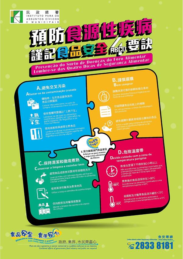 民署一直致力推动食品安全教育工作,二○一八年起恒常于每月最后的星期四举办“食品安全与环境卫生基础班”,以食品安全卫生指引辅以《外卖及堂食处理食品卫生指南》作为教材,内容涵盖由采购、贮存、处理方式、个人卫生等食品安全注意事项,以及日常操作中容易忽略的食安要点。七月基础班作为“食品安全关注日”系列活动,将讲授由民署编辑的一套多语文版本“食品安全4要诀ABCD”,内容围绕避免交叉污染(Avoid Cross Contamination)、谨慎选购(Buy Right)、保持清洁和彻底煮熟(Clean and Cook Completely)以及危险温度带(Danger Temperature Zone),鼓励不同语言及文化背景人士学习,并运用在日常烹调制作食物之中,以防范及减少食源性疾病发生的风险。课程又会介绍《食品安全法》的主要内容,加深业界认识法律中所订明的责任与义务,呼吁业界与政府应保持良好沟通,通报可能存在的食品风险。此外,亦会重点介绍有效预防和控制鼠患的方法,以提高食品业界对环境卫生及防治鼠患的意识。