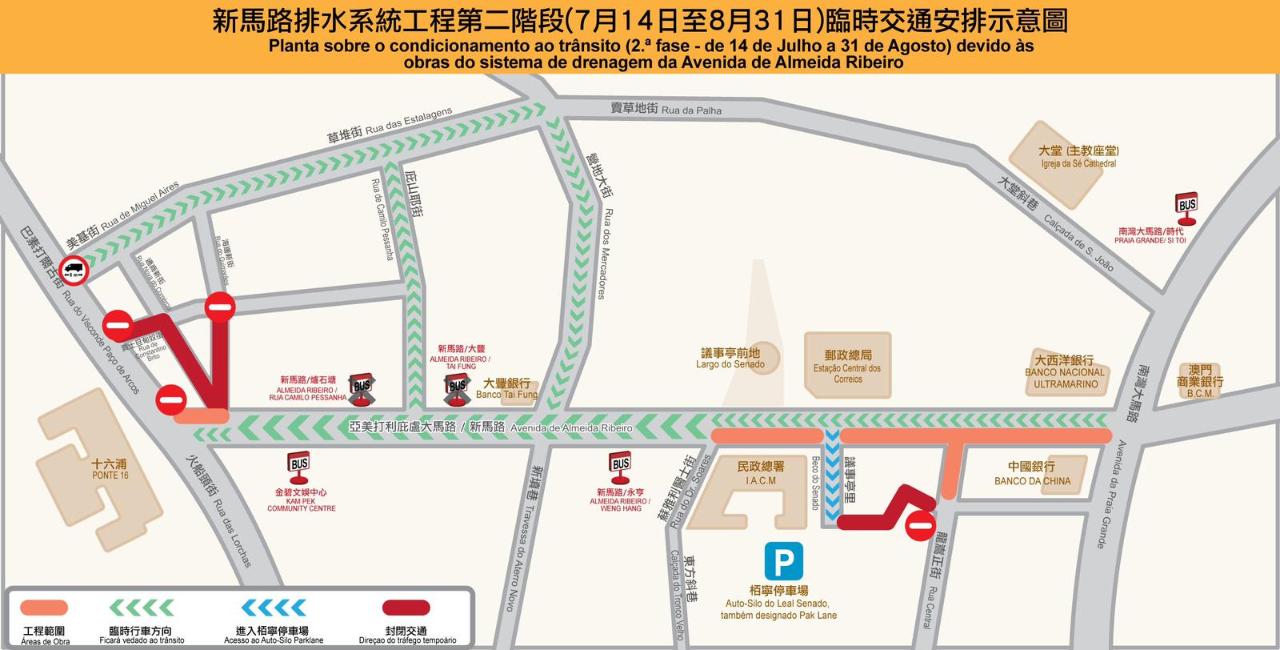根据气象局信息,因正值天文大潮,加上东风较大,预计明天(16日)上午九时至下午两时,内港一带会出现水浸情况。再加上新马路工程初步进入第二阶段的改道措施,治安警察局会在明早因应实际情况,增派适量警员到周边指挥及疏导交通,同时与交通事务局保持紧密联络,有必要将采取临时交通改道措施,请驾驶者留意。