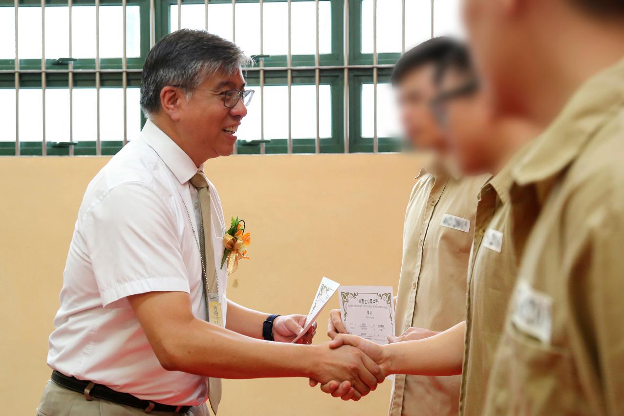 与此同时,何少薇处长和梁佑澄校长还分别在结业礼上致辞。何处长感谢教育暨青年局长期以来对惩教工作的支持,给予在囚人回归学习的机会,亦勉励在囚人珍惜光阴,做好各方面准备,以便出狱后更容易重新适应社会。而梁校长分享一则故事,讲述释囚人士如何从被别人歧视到最后得到接纳的过程,鼓励在囚人要勇敢面对生活上的挑战,并用心接纳自己。此外,梁校长亦乐见本年度在囚人取得优异的成绩,勉励他们继续在学业上付出努力争取佳绩。而在囚人为答谢老师们的悉心教导和嘉宾莅临支持,分别献唱多首歌曲、演出话剧和作出感谢演说,典礼在一片感恩和温馨的气氛下圆满结束。