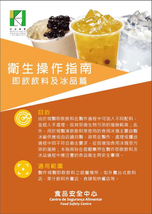 民署持续对本澳各类食品生产经营场所及销售点进行巡查监察,并按照风险程度与市民的消费趋势作规划管理。近期,本澳手摇饮品市场发展蓬勃,手摇饮品无论在外观、口味以至配料款式上都愈趋多样化。民署食安中心为提醒手摇饮品商户,注意食品安全与产品质量,保持个人及环境卫生清洁,编制了一系列与即饮饮料及冰品相关的卫生指引及操作指南,供业界检视其日常营运。当中,尤其要求业界注意制作饮品的原材料及配料,如茶叶、饮料冲剂、珍珠、椰果等的食用限期,并且须清晰地标示于包装上,切勿使用已逾期之食材,否则会触犯法例而被检控;用于调配饮品的冰粒须为食用等级,时刻保持冰桶整洁,并将冰铲存放在独立清洁的容器内,如商户自设制冰机,须定期清洁维护,确保冰粒安全卫生;另外,部份已预先处理的备用食材,如切开的水果、珍珠粉圆或奶油奶盖等,须包好并冷藏在摄氏5度以下。