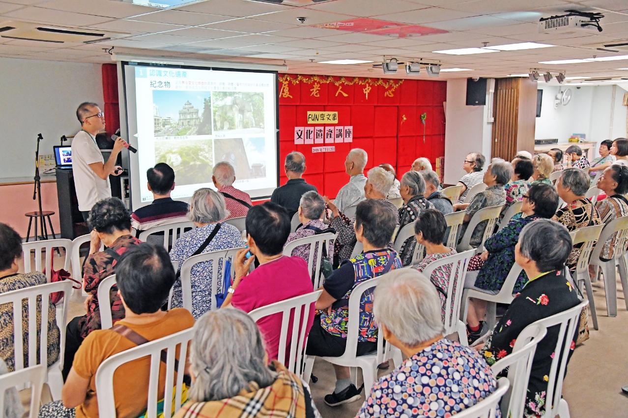 “Fun享文遗”自四月推出起,已走进澳门校园向逾千名学生分享文化遗产知识,并逐步拓展至社区。日前已向澳门工会联合总会望厦老人中心、澳门街坊总会绿扬长者日间护理中心、澳门街坊总会新桥坊会颐康中心及菩提长者综合服务中心等多间长者机构,以生动有趣的方式介绍文化遗产的价值和《文化遗产保护法》的主要内容,增加长者对文化遗产保护及相关工作的认知,讲座期间更加入旧照片分享环节,参与的长者更积极分享当年往事,气氛活跃融洽。