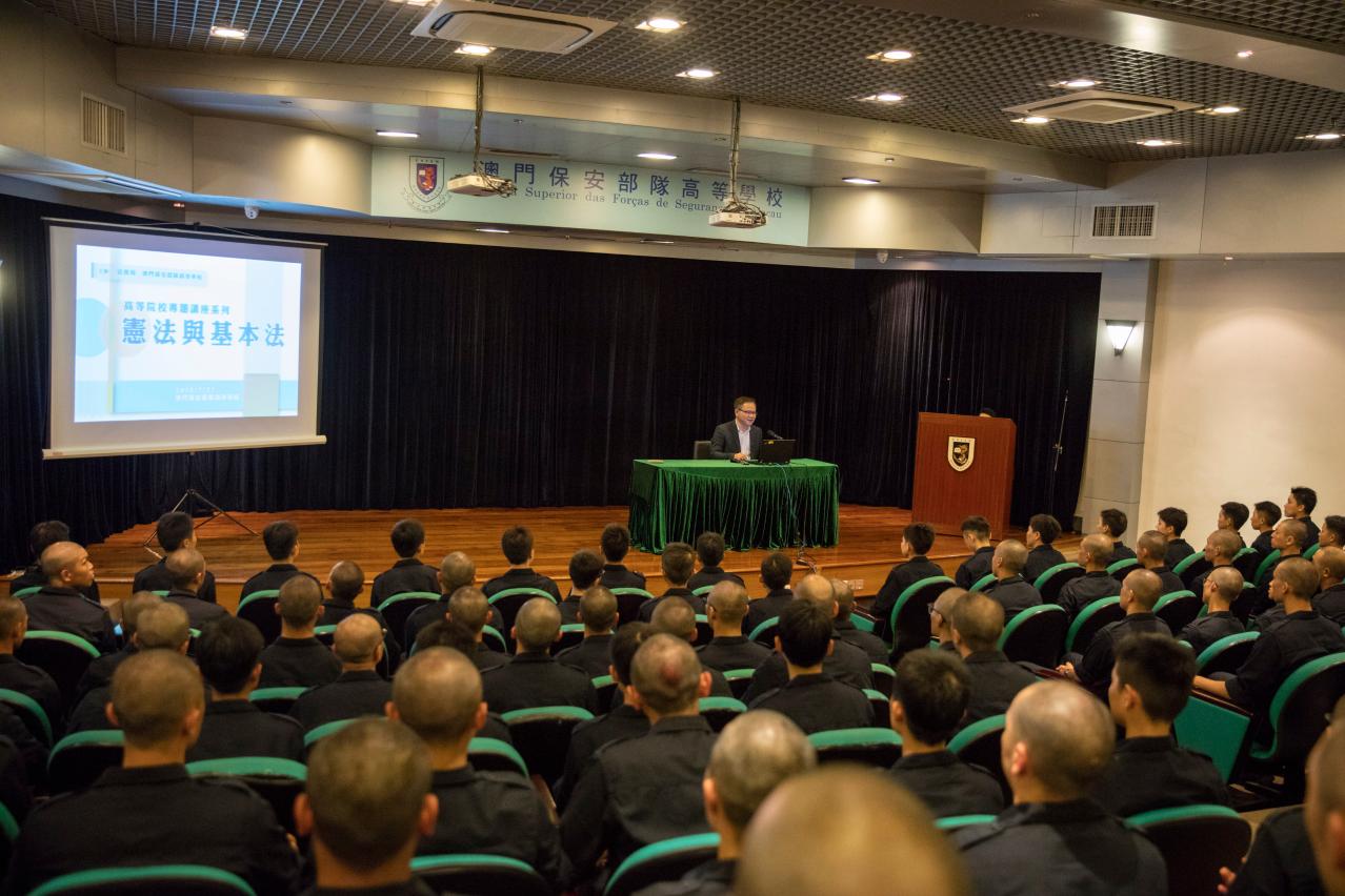 法务局与澳门保安部队高等学校合办的本年度第三场高等院校宪法与基本法专题系列活动已于7月27日顺利举行,活动邀请澳门大学法学院蒋朝阳教授主讲,透过讲座及交流茶聚,围绕“宪法和基本法共同构成特别行政区宪制基础”这一主题全面阐述两法的内容,并就《宪法修正案》的修改条文深入解说,引领约150位海关学员从多角度认识两法的内容及相互关系。