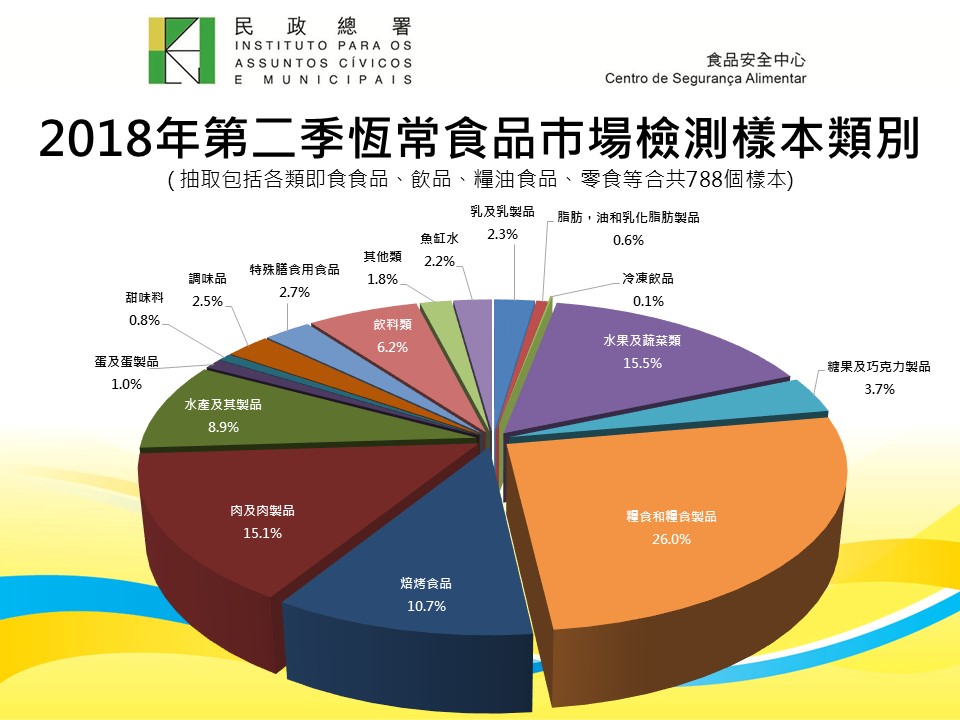 为保障消费者的食用安全,食安中心依据目前流通市场的食品种类和特点,制定各类型的食品调查抽样计划,包括“常规食品调查”及“食肆食品调查”计划。抽样调查的范围包括本澳各区之超级市场、杂货店、百货公司、饮食场所及外卖店等,抽取各类即食食品、饮品、粮油食品、零食等。食安中心在本年第二季合共抽取七百八十八个样本进行化学、微生物学及辐射水平等检验,整体合格率99.9%。