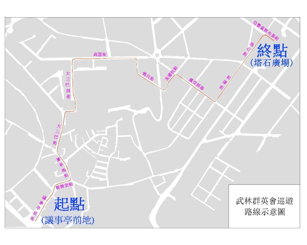 配合体育局举办武林群英会巡游活动,议事亭前地、大三巴及塔石广场一带多处道路,8月4日(周六)及5日(周日)下午封闭交通或有限度通车,高伟乐街、高园街及塔石街部份泊车位及上落客货区则由8月2日(周四)起分阶段暂停使用(详见下表)。