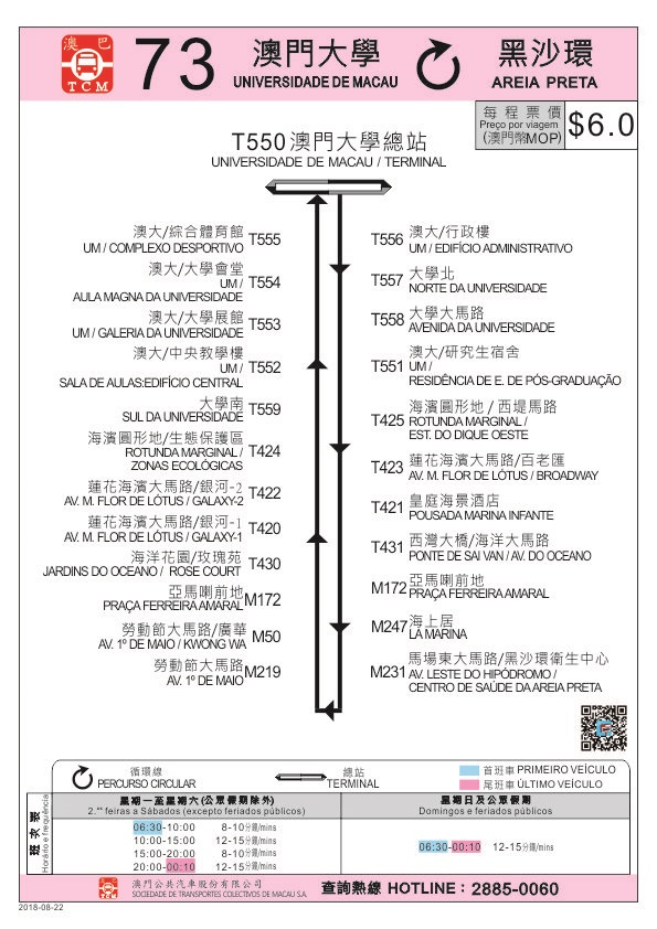 配合澳门大学开学,由8月22日(周三)起恢复71、72及73路线的班次服务;当中,71及73路线非繁忙时段调整为12至15分钟一班。