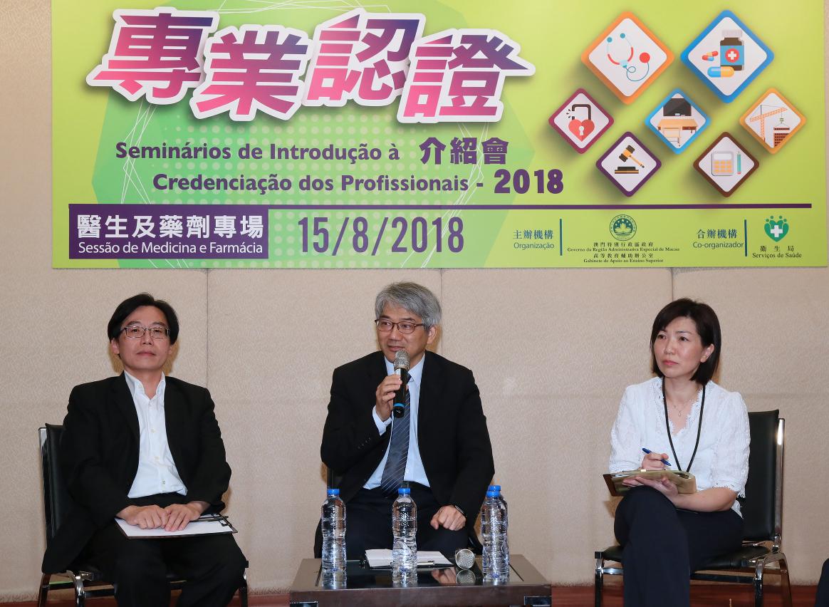 由高等教育辅助办公室主办、卫生局合办的“专业认证介绍会2018 – 医生及药剂专场” 8月15日于黑沙环卫生中心举行,介绍会共吸引就读相关专业的大学生、家长等逾130人参与。卫生局局长李展润、药物事务厅厅长蔡炳祥、医务活动牌照科负责人梁佩珊、高等教育辅助办公室代主任曾冠雄及代副主任陈家豪出席了活动。
