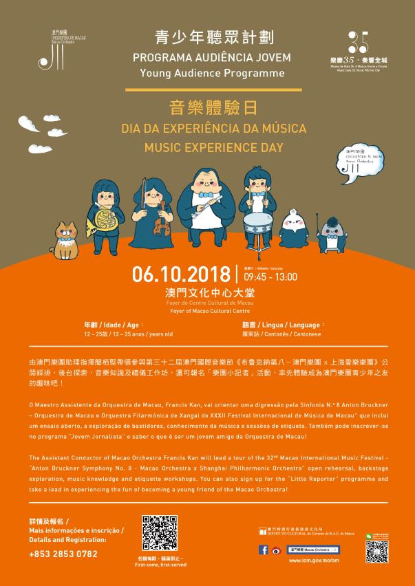 是次“音乐体验日”活动内容丰富,包括由澳门乐团助理指挥简栢坚带领学生参与第三十二届澳门国际音乐节《布鲁克纳第八-澳门乐团 x 上海爱乐乐团》的公开彩排、后台探索、音乐知识及礼仪工作坊,参与者还可报名参加“乐团小记者”活动,体验成为澳门乐团青少年之友的趣味。所有参与者当天将可获澳门乐团的精美礼物一份。