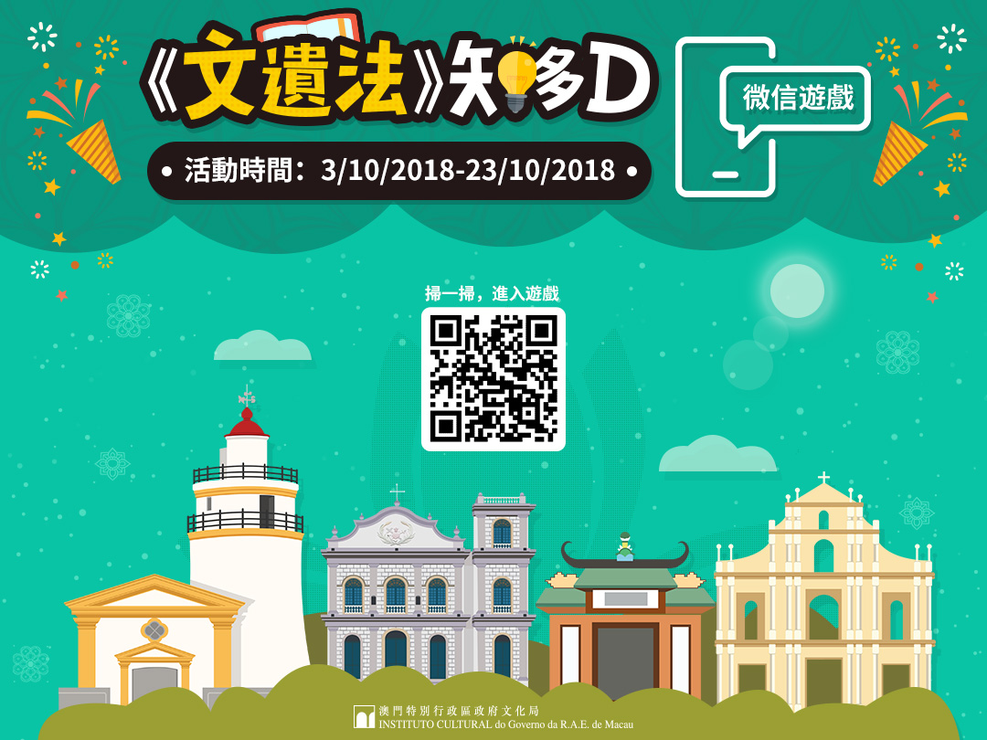 文化遗产是本澳珍贵的文化资源,为让其世代相传,需要社会的共同努力,做好保护工作,共同发挥“文化遗产‧共护共享”的精神。文化局早前已透过不同的方式宣导,包括于社区、学校及机构举办“Fun享文遗”讲座、派发宣传小册子等活动。是次举办有奖问答游戏,续向普罗大众传递文物保护的重要性以及《文遗法》等相关信息。有奖问答游戏由今日(10月3日)起至10月23日举行,参加者可扫瞄有关QR Code二维码,或于微信公众号“澳门文化局”内链接进入游戏;问题内容主要围绕《文遗法》,参加者需快而准答对指定数量题目,回答问题时间越短,答中题目越多,名次越高。