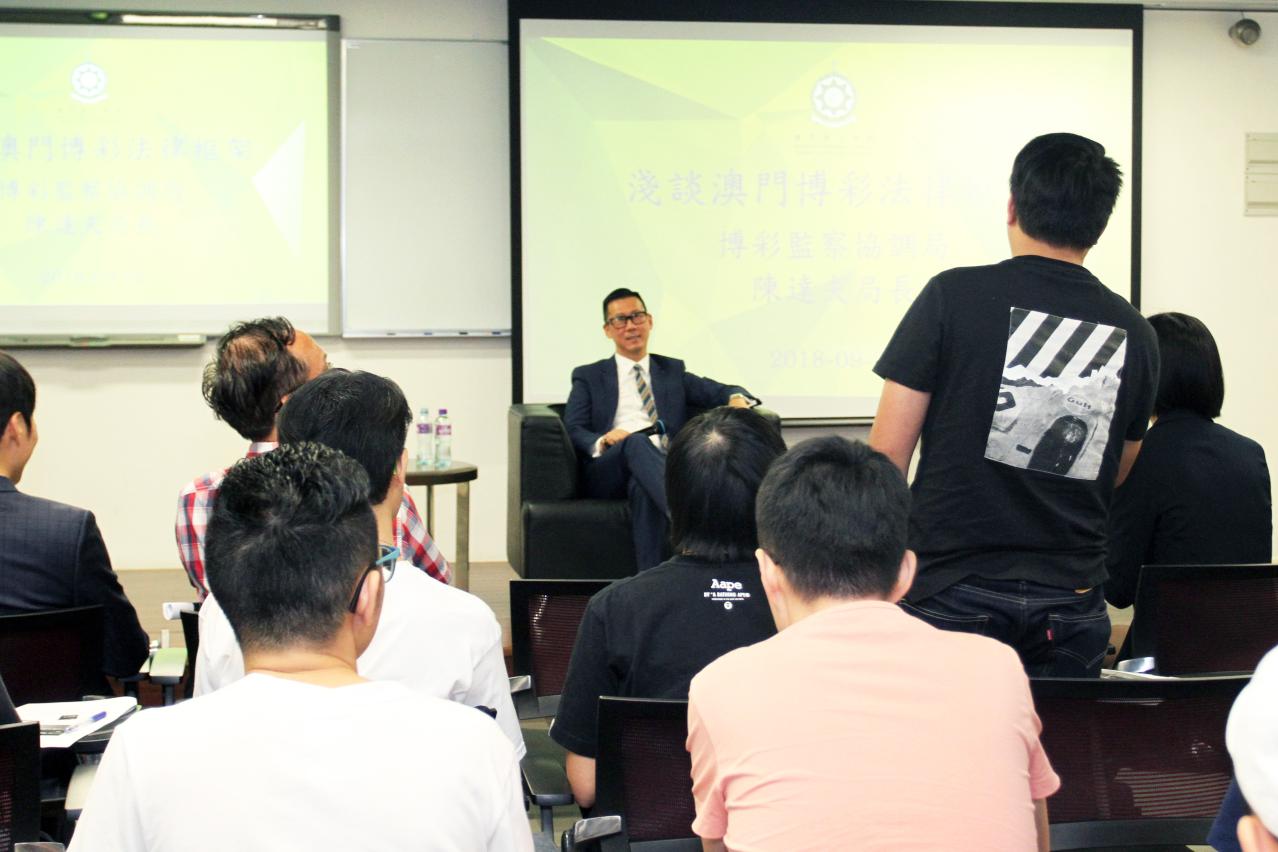 博彩监察协调局局长陈达夫应澳门理工学院博彩教学暨研究中心邀请,于九月二十八日,为博彩与娱乐管理学位学士学位课程学生及教职员工主讲“澳门博彩法律框架及重点”专题讲座。理工学院副院长李雁莲及师生共五十余人出席了讲座。这是陈达夫继去年以来再次前来理工博彩教学暨研究中心为同学授课,体现了特区政府对博彩管理人才培养的重视。讲座圆满成功,受到与会者的赞誉和好评。
