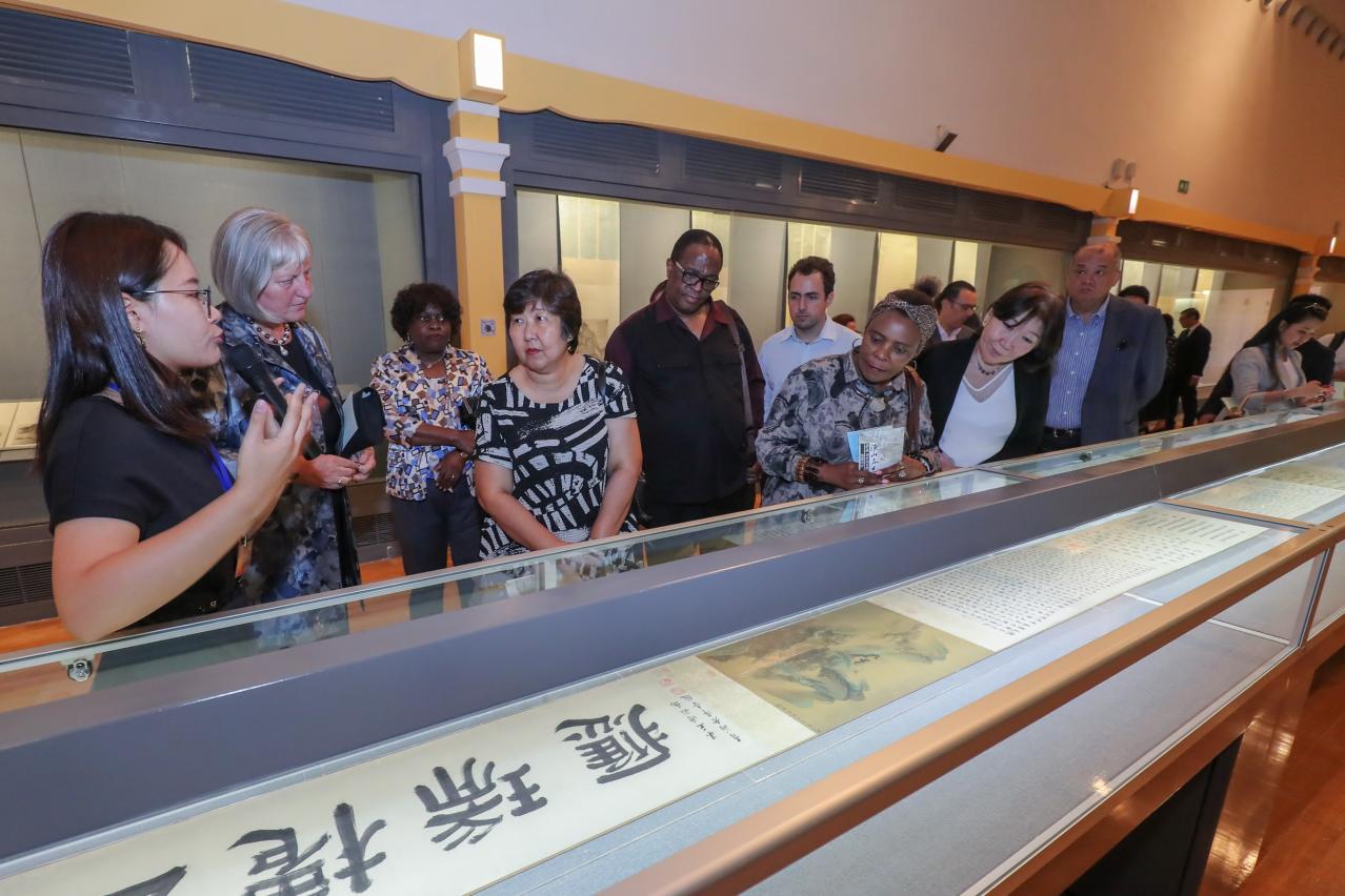 领事团在文化局局长穆欣欣等人的陪同下,首先前往澳门艺术博物馆参观“渔山春色──吴历逝世三百周年书画特展”。吴历是清初着名画家,康熙年间曾随比利时籍耶稣会士柏应理来澳,以画跋和诗集《三巴集》记下在濠镜的生活和感受。展览展出吴历不同时期的书画作品,以及其师友书画作品共84件(套),此为吴历的首个大型个展,近半数展品更是首次公开展出,较全面地展示吴氏的艺术和笔墨面貌。适逢今年为吴历逝世300周年,展览让领事们瞭解清代绘画最高水平的一角,感受灿烂的中华文化魅力。