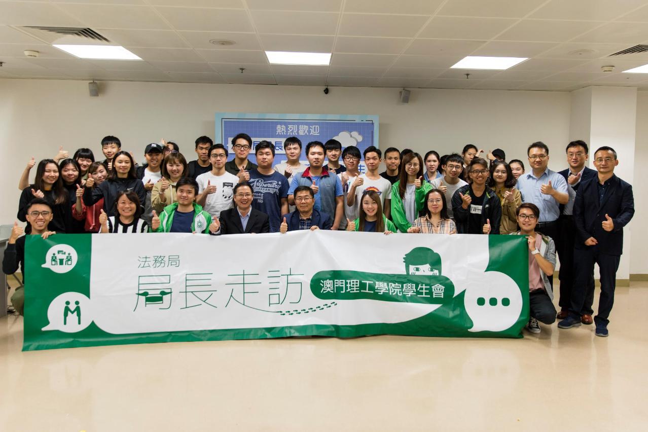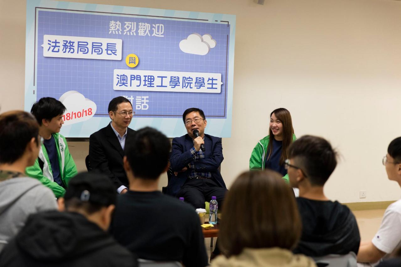 为加强与本澳青年学生的沟通交流,法务局局长刘德学于10月18日下午率领部门团队前往澳门理工学院,以“寻觅‘理’想”为主题,与50多名理工学生会成员交流,了解学生对学业、生涯发展的想法,以及聆听他们对法务工作方面的建议。刘德学局长在会上勉励学生要积极装备自己,把握未来粤港澳大湾区发展新机遇。