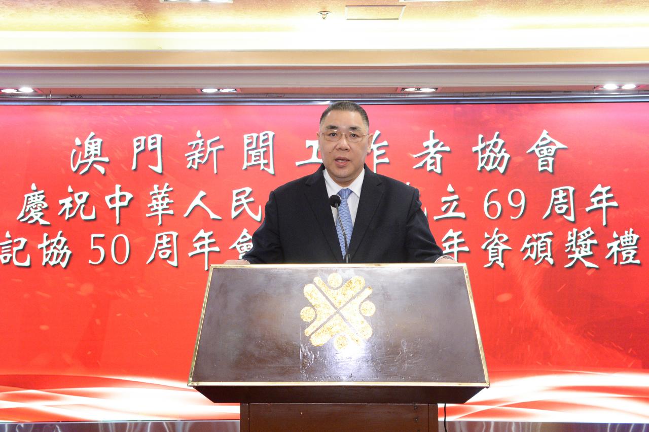 行政长官崔世安今(22)日傍晚出席澳门新闻工作者协会庆祝国庆暨颁发会员服务年资奖联欢宴会,他在致辞时赞扬澳门新闻界长期坚持爱国爱澳、服务市民的立场,对维护社会和谐、成功落实“一国两制”作出了努力和贡献。