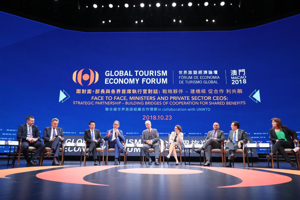 一连两天议程于23及24日开展,其中,由论坛与联合国世界旅游组织合办的 “面对面,部长与各界首席执行官对话”为今届论坛的讨论环节揭开序幕。多位部长级官员或政府官员及企业领袖应邀担任演讲嘉宾, 联合国世界旅游组织执行主任祝善忠以《战略伙伴——建桥梁、促合作、利共融》为主题作序,其后,演讲嘉宾就 “2018中国—欧盟旅游年”对促进中欧旅游的广泛合作,以及如何通过包括创新、科技、旅游便捷化和交通配套等拉动和深化合作,促进两地互惠共赢及可持续发展,展开讨论。参与该环节的嘉宾包括:奥地利联邦可持续发展和旅游部─旅游和区域政策副部长乌尔里克‧劳赫—考希曼;爱沙尼亚经济事务及通讯部经济发展部副部长维瓦‧卢比;葡萄牙旅游国务秘书安娜‧门德斯‧戈迪尼奥;澳门特别行政区政府社会文化司司长、世界旅游经济论坛执行主席谭俊荣;马来西亚旅游艺术文化部、旅游政策及国际关系副部长Mohd Daud Mohd Arif;英国文化协会主席克里斯托弗‧罗德里格斯;途易集团名誉主席兼世界旅游经济论坛荣誉主席米歇尔•弗伦策尔;世界旅游及旅行理事会总裁兼首席执行官、世界旅游经济论坛荣誉主席格洛丽亚•格瓦拉•曼索;Thomas Cook 托迈酷客首席执行官戴安哲;Mystic Invest 主席马里奥‧费雷拉;塔林客集团首席执行官帕沃‧诺盖内,以及广州白云国际机场有限公司董事长邱嘉臣;此环节由CACHET CONSULTING创办人及主席、联合国世界旅游组织秘书长特别顾问阿妮塔‧门迪华达担任主持。