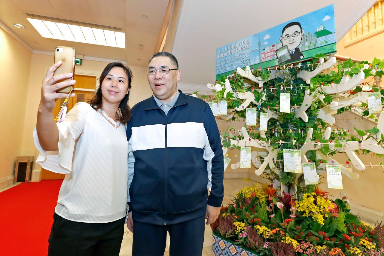 行政长官早上接近十时回到政府总部,在行政长官办公室主任柯岚陪同下视察情况,先到礼宾楼大堂查看“愿望树”,关心居民对政府工作和社会民生事务的留言,并欢迎前来参观的居民及游客,有参观人士把握机会与行政长官自拍留念。他其后步出政府总部正门,与到访的居民和游客亲切交流和合照。期间有居民向行政长官表示:“希望在你的带领下,澳门会愈来愈好,大家一起努力。”行政长官回应称:“这是大家的共同愿望。”此外,他亦关心游客来游览的感受,希望他们多来澳门走走,并表示澳门欢迎他们。