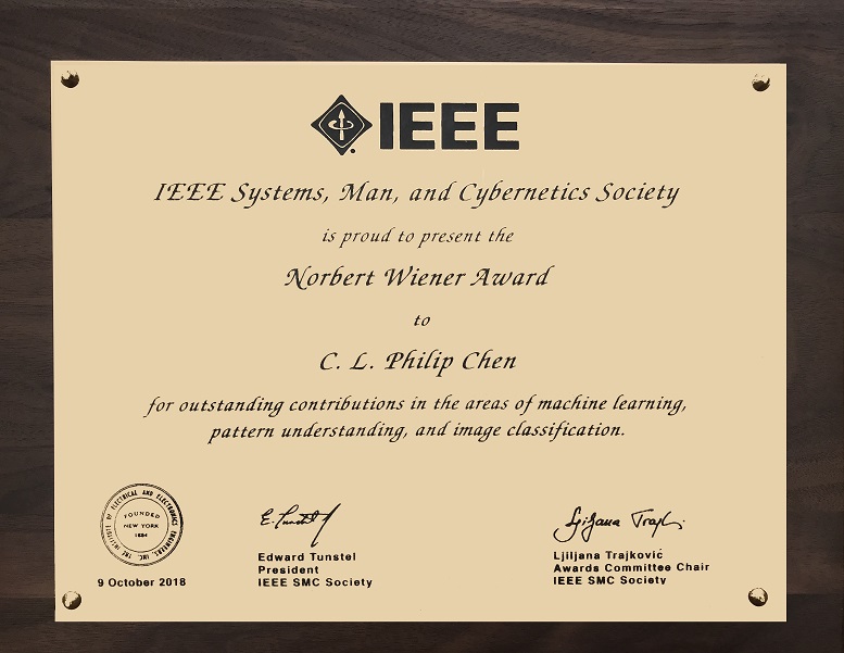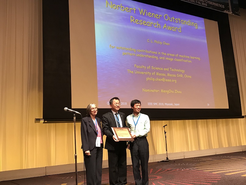 澳门大学科技学院讲座教授陈俊龙参与于日本宫崎市召开的“2018年IEEE系统、人与控制论国际会议",并获国际奖项“诺伯特.维纳奖"(Norbert Wiener Award)。该奖是系统与控制论领域的最高奖项,表彰了陈俊龙在机器学习、模式理解、图像分类等领域的研究作出的杰出贡献。
