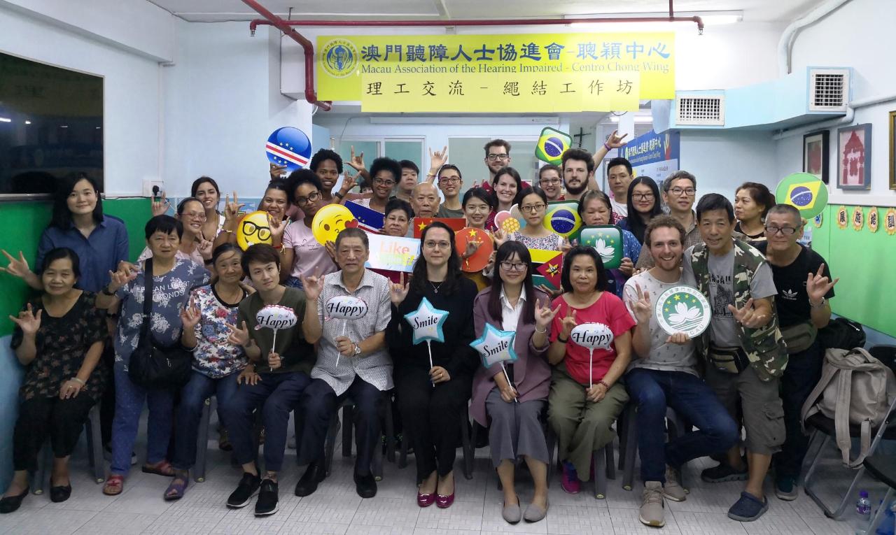国际生前往澳门听障人士协进会辖下聪颖中心探访,受到中心负责人及学员的热情欢迎。国际生透过学习简单的手语如“父母及兄弟姐妹”、 “喜欢”、“理工学院”、“学生” 等,瞭解到用手势的原因以及语言背后的文化意义。同场更安排绳结工作坊,由澳门听障人士协进会安排成员担任导师教授编织中国结,让国际生认识到中国编织的玲珑美。