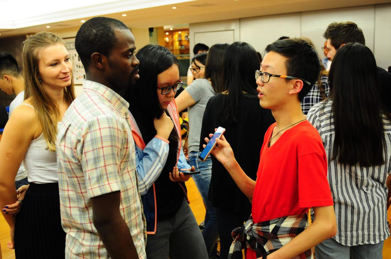 活动之一“中外学生结语伴”在理工致远楼大堂举行,吸引了近百名中外学生参加。举行活动前的数周,各班班长在老师做好了充分筹备,创建微信群集思广益,确定活动程序、活动专案及主持人。活动当日,中外同学按分组,在一年级国际汉语教育母语班学生的集体诗朗诵后,随即开始了各项结语伴活动。现场气氛欢乐和谐,这些趣味活动吸引了各组同学一次又一次相互挑战,如中文接力葡语传递号码、中文解说国际学生动作呈现、二人合作徒手运送气球等,参与学生还三两成对结成语伴一起交流,踊跃互动。