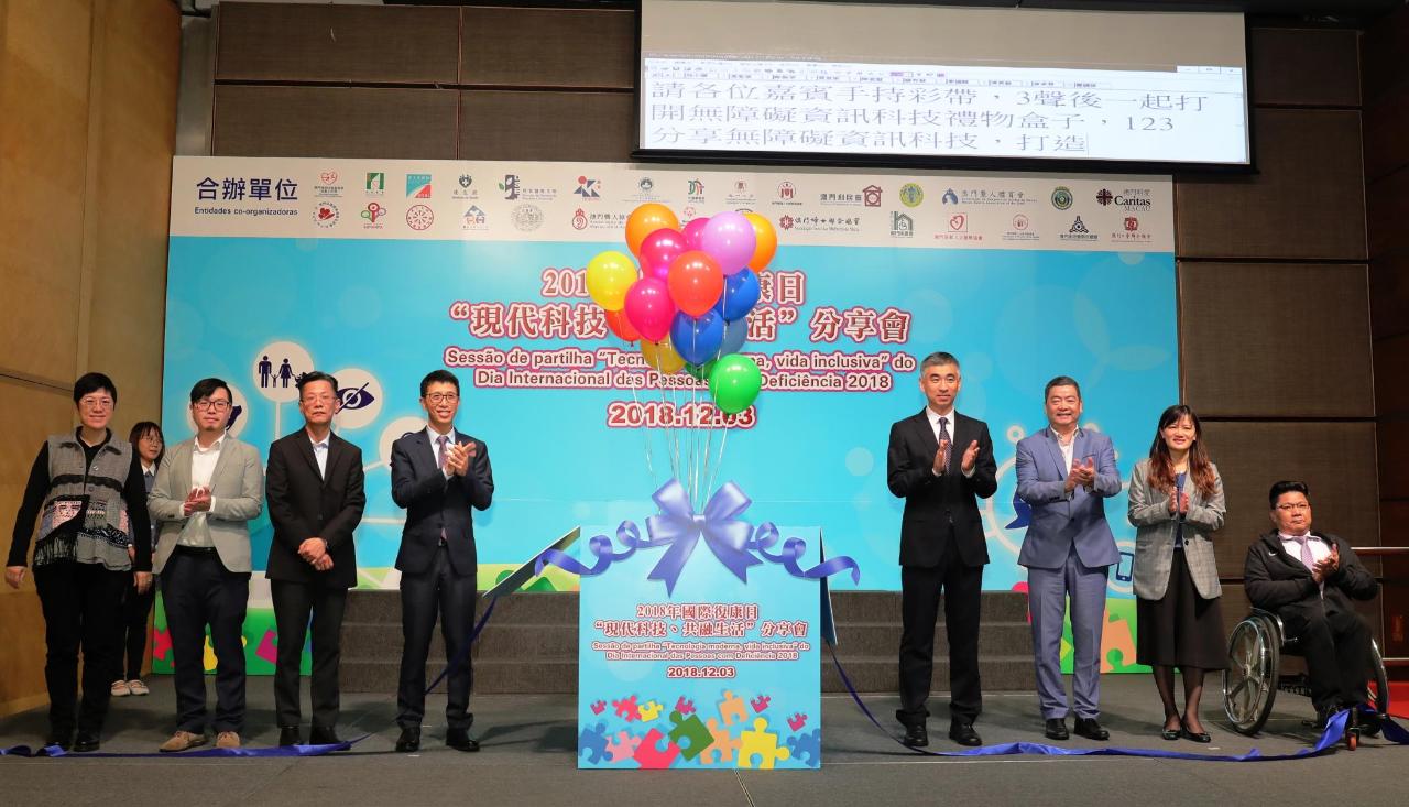 为响应联合国订定的“国际复康日”,社会工作局联同7个政府部门及21间民间机构合办的“现代科技、共融生活”分享会于今(3)日在澳门旅游塔会展娱乐中心举行,传递“均等机会,全面参与”的讯息,吸引了来自本澳商界、康复团体、大专学生等超过160人参与。