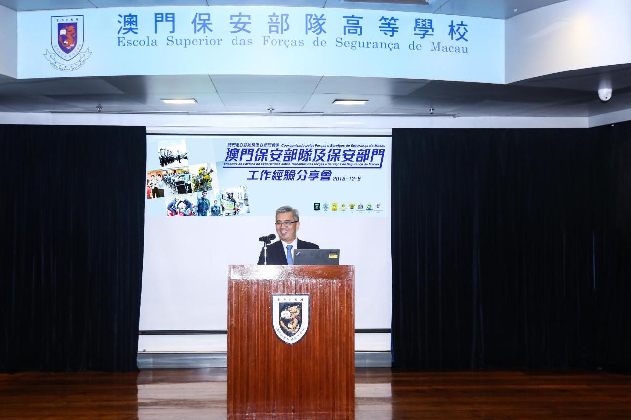 于2018年12月6日上午10时,澳门保安部队高等学校举办“澳门保安部队及保安部门工作经验分享会”,冀透过人员分享实务上的宝贵经验,集思广益,从而提升警务工作的效能及人员间的凝聚力,以应对日趋复杂的社会环境。保安司黄少泽司长、保安司司长办公室张玉英主任、澳门保安部队高等学校许少勇校长、消防局梁毓森局长、司法警察局薛仲明局长、治安警察局刘运嫦代局长、澳门保安部队事务局关启荣代局长、警察总局罗伟业局长助理、警察总局吴锦华局长助理、澳门海关黄文忠助理关长、周见霭代任助理关长以及各部门代表近190人出席了分享会。