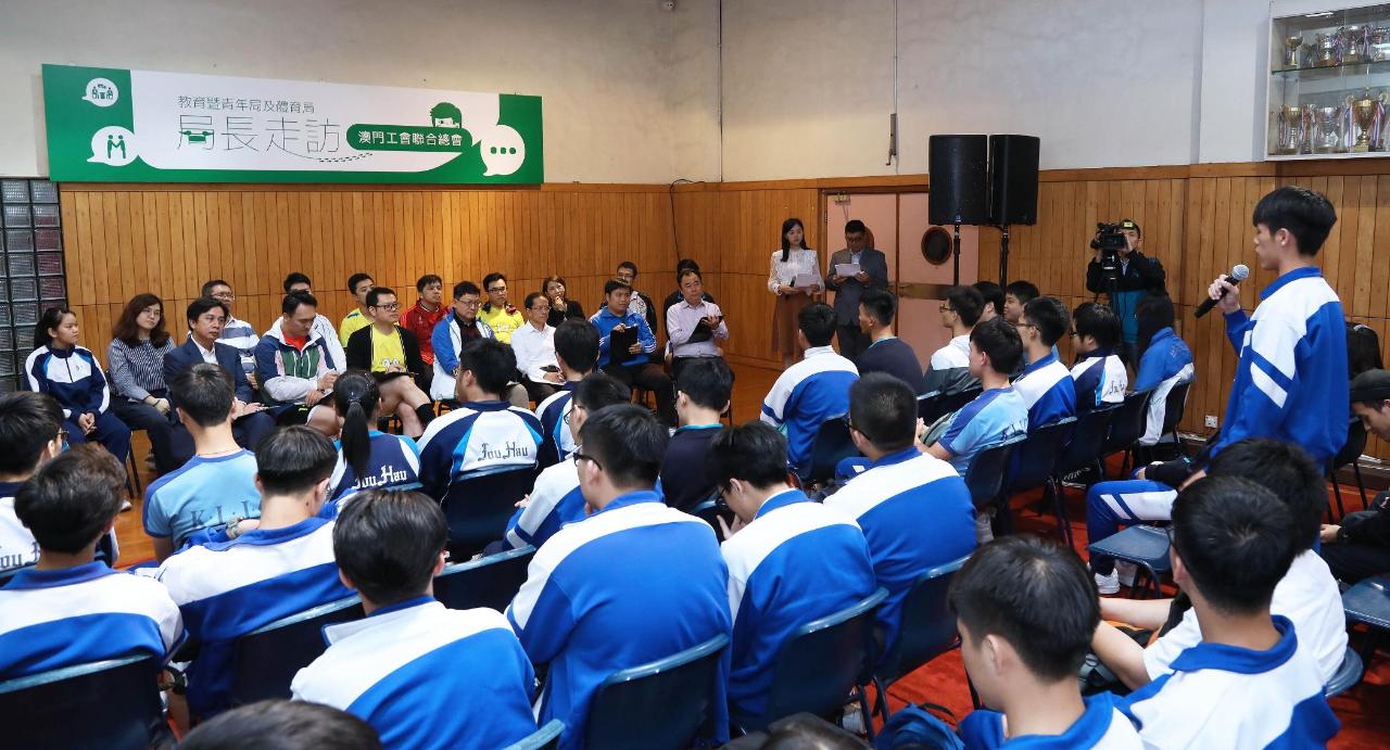 为让政府官员与青年有更多互动交流的机会,同时向青年推广健康生活模式,鼓励青年多做体育锻炼,养成恒常运动的习惯,加强身心健康,教育暨青年局与体育局于2018年12月5日(星期三)走访澳门工会联合总会。活动分三部分进行,包括参观澳门工联设施、体育比赛,以及茶会及互动交流。出席活动的包括教育暨青年局局长老柏生、副局长龚志明,体育局厅长邹国伟,教育暨青年局厅长黄健武、陈旭伟及两局各级主管人员,澳门工联青委主任冯家健、体委副主任林锦雄及工联部委代表,联同一众青年朋友,参与人数将近150位。