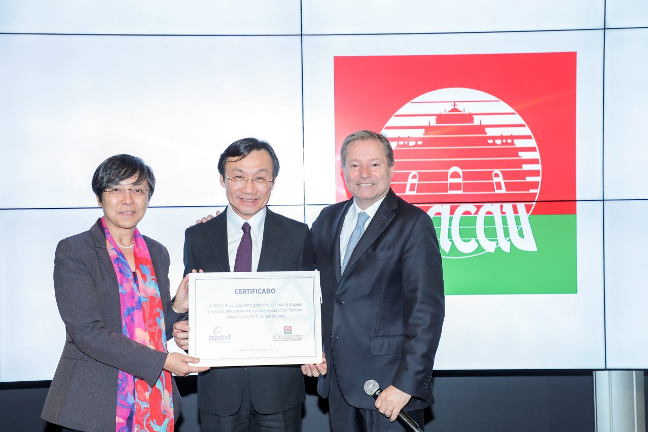 澳门特别行政区政府社会文化司司长谭俊荣出席2019年葡萄牙里斯本旅游展并参观澳门展位及见证葡萄牙旅行社协会(APAVT)向澳门颁发2019年理想旅游目的地证书。葡萄牙旅行社协会主席佩德罗•科斯塔•费雷拉(Pedro Costa Ferreira)向澳门特区政府旅游局局长文绮华颁发证书。澳门获此肯定,将吸引葡萄牙旅游业界于今年及旅游展期间予以更多关注及宣传。