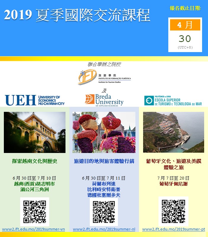 旅游学院将与越南、荷兰及葡萄牙的伙伴院校分别合办三个2019夏季国际交流课程,透过专题讲座、工作坊及考察活动,使学员掌握多个旅游课题的知识和应用,同时透过此海外学习交流,扩阔国际视野。