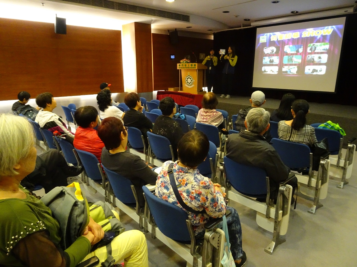 澳门理工学院长者书院与司法警察局日前在理工学院演讲厅为长者学员合办了一场名为“司警防罪SHOW互动游戏”的讲座,由司法警察局警务及公共关系处代表刘佩雯及陈倩婷任主持和演讲,参与的长者学员众多,反应热烈。