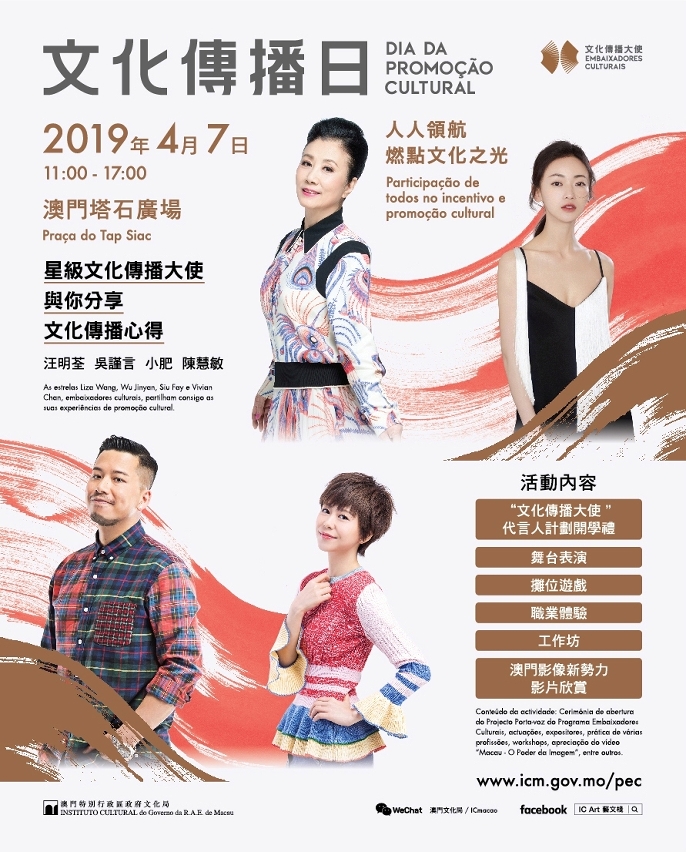 有关“文化传播大使”代言人计划及文化传播日节目流程等更多资讯可留意网页www.icm.gov.mo/pec。