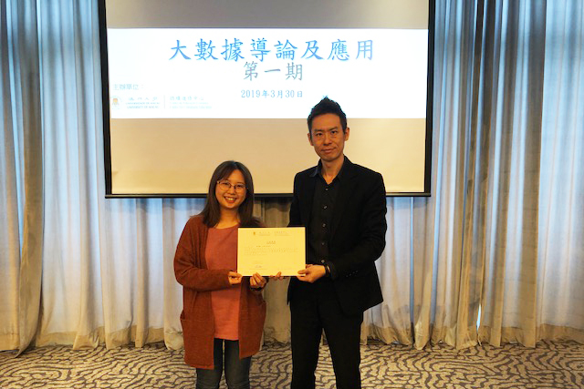 为配合澳门大学于2019/2020学年新增的理学硕士学位(数据科学)课程,澳大持续进修中心开办了专为对智能大数据及数据科学有兴趣的人士而设的短期课程:大数据导论及应用,首届学员已顺利完成课程,第二期课程预计于今年内推出。
