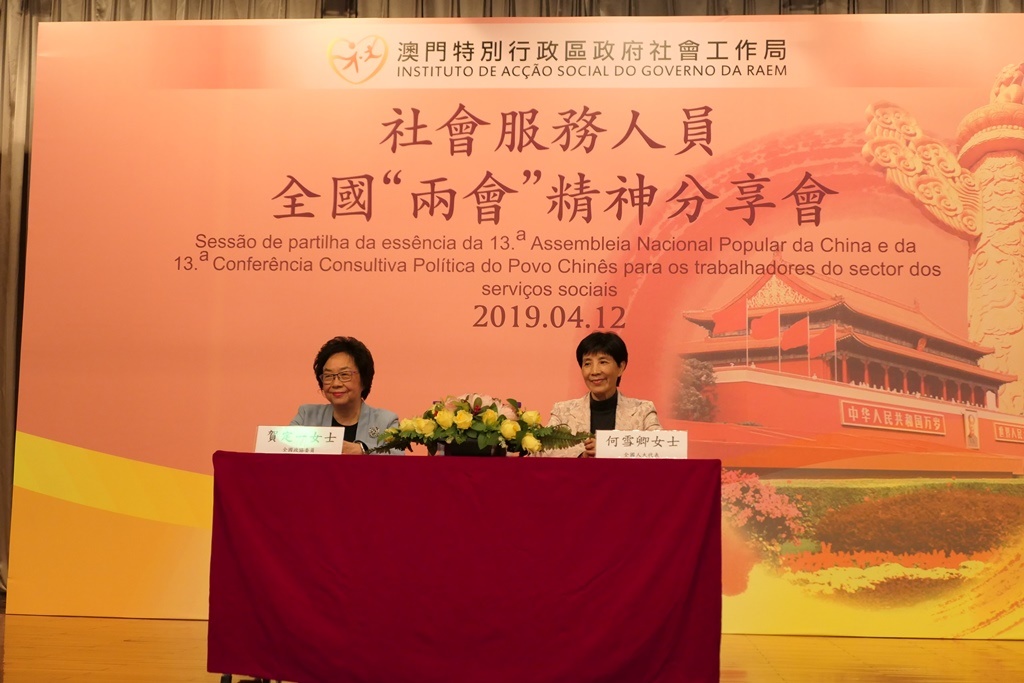 社工局在中联办社会工作部大力支持和协助下举办是次分享会,邀请澳区全国人大代表何雪卿、澳区全国政协委员贺定一担任主讲嘉宾。何雪卿在专题发言中首先介绍全国人大常委会的主要精神,分析国家当前的形势,特别在中美贸易磨擦以及经济下行的困难中,国家坚持“以人民为中心”为主线,今年工作重点除解决就业问题和脱贫任务外,还完善各项医疗和社会福利政策,全面改善人民的生活。何雪卿作为澳区全国人大代表积极建言献策,促进澳门各界主动融入粤港澳大湾区建设,推动经济适度多元发展以及 “一国两制” 行稳致远。