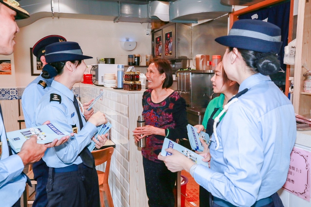保安高校陈国棠副消防总长、徐小华副警司、李嘉仪副警司及黄仲胜副一等消防区长,继4月16日到路环市区宣传后,翌日(17日)上午前往上述受风暴潮影响较严重地区,持续进行“台风期间风暴潮低洼地区疏散撤离计划”的宣传活动,向当地商户及居民派发关于《台风期间风暴潮低洼地区疏散撤离计划》、《风暴潮防灾指引》及《风暴潮高点及低洼地区音频警报信号》的小册子,并向其讲解相关小册子的内容,同时向市民介绍4月27日由多个部门联合进行的“水晶鱼2019”全澳大型民防演习,以及报名的方法。