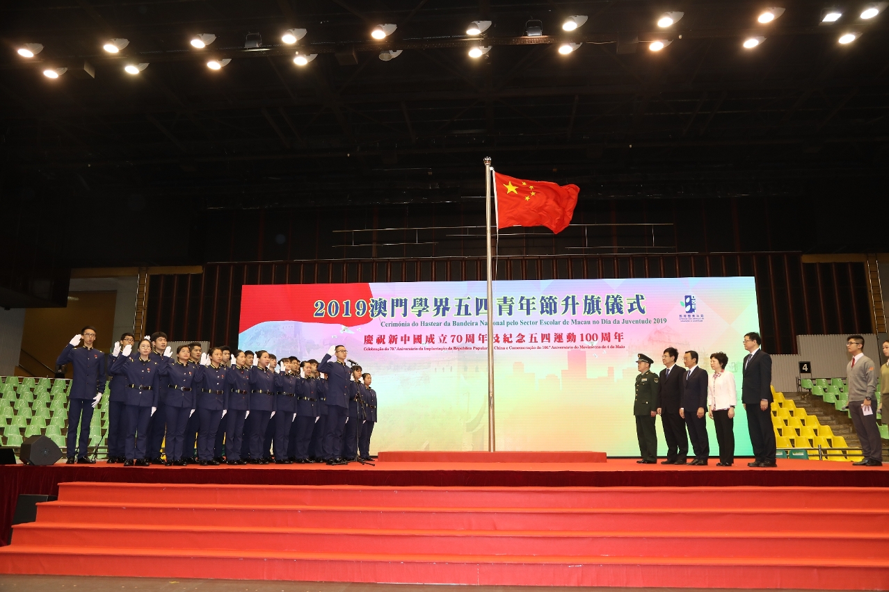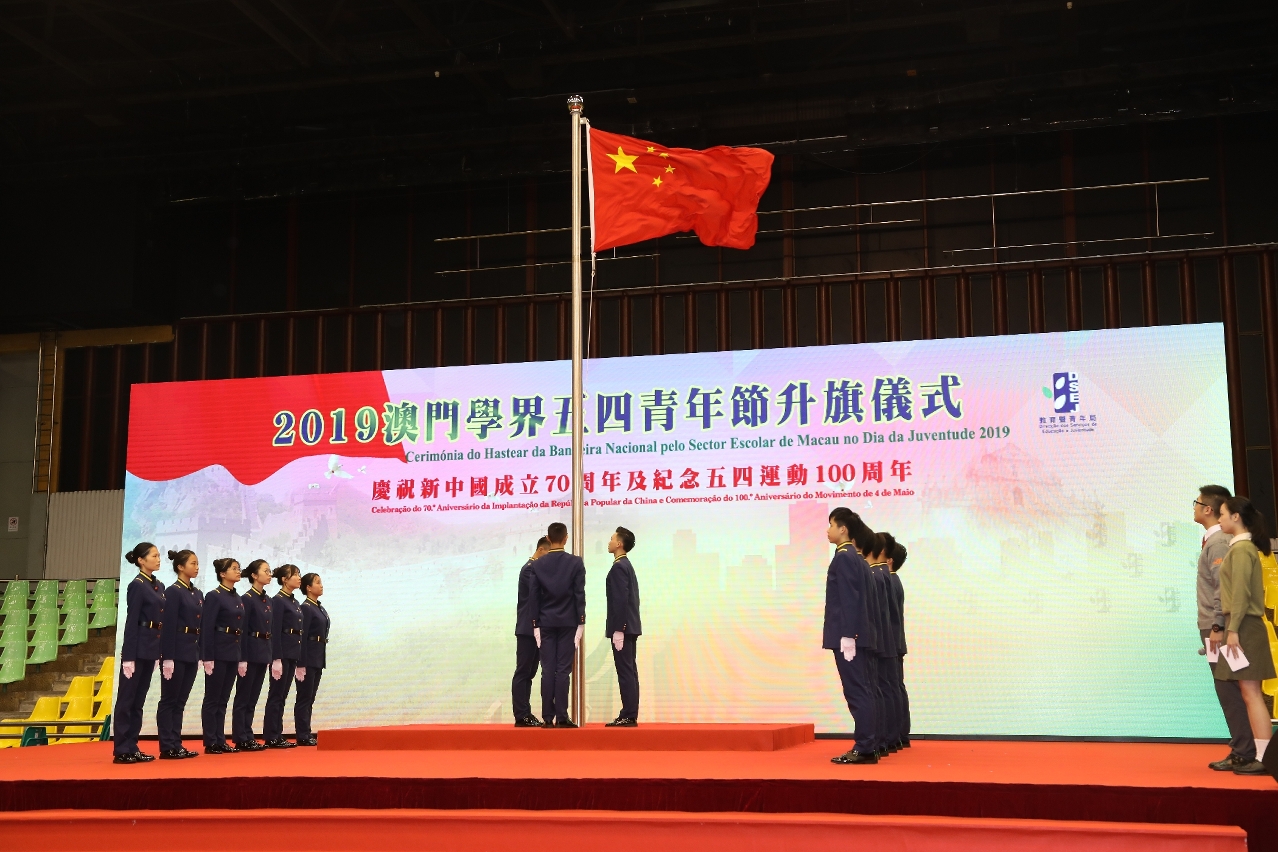 一百年前,五四运动汇聚各族各界爱国力量,捍卫国权,宣扬民主和科学,先辈殚精竭虑救国强国的精神对中华民族追求发展进步具里程碑意义。为庆祝新中国成立70周年及纪念五四运动100周年,推动爱国爱澳教育,加强学生对五四运动精神和历史的认识,继承五四爱国主义旗帜,为实现中华民族伟大复兴的中国梦而奋斗,教育暨青年局于5月4日早上在澳门综艺馆举行“澳门学界五四青年节升旗仪式"。社会文化司司长谭俊荣、中央人民政府驻澳门特别行政区联络办公室副主任薛晓峰、中华人民共和国外交部驻澳门特别行政区特派员公署特派员沈蓓莉、中国人民解放军驻澳门部队司令员徐良才、社会文化司司长办公室主任叶炳权、教青局局长老柏生、中央人民政府驻澳门特别行政区联络办公室教育与青年工作部部长徐婷、教青局各部门主管、非高等教育委员会委员、青年事务委员会委员、教学人员专业委员会委员以及82所学校师生和28个青年社团的代表,共超过2,000人出席。