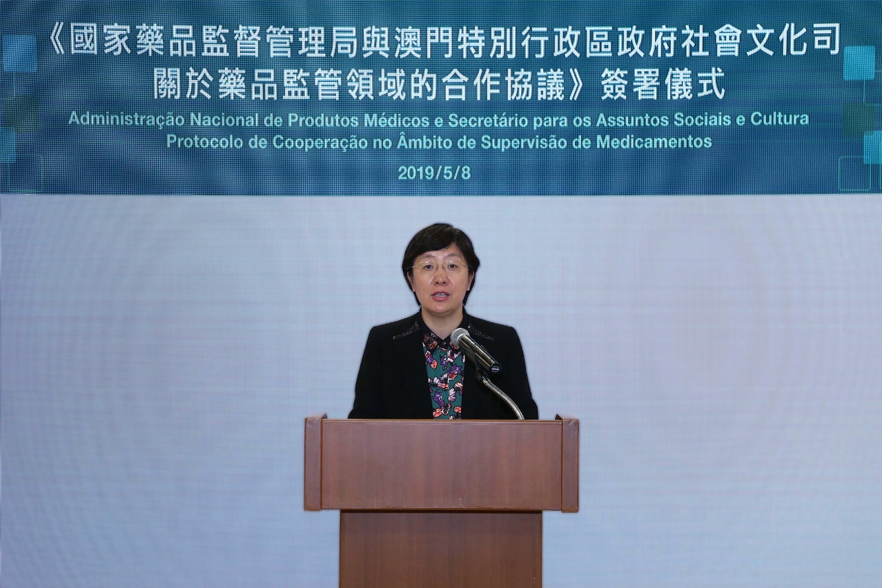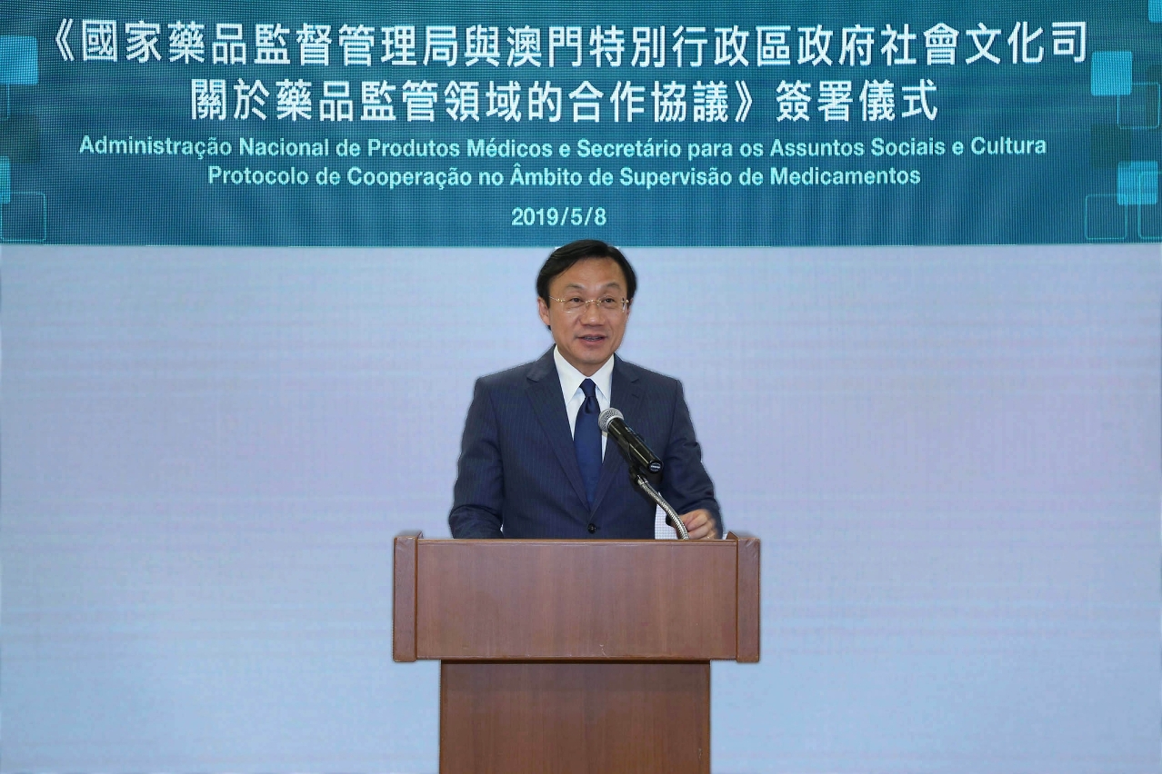 谭俊荣司长致词时表示,特别感谢国家药品监督管理局多年来对澳门药物监管提供支持与协助。他指出,随着近年新型药物涌现,抗生素耐药、药物安全问题备受关注,以及信息社会的急速发展等,都为药物监管工作带来严峻的挑战,签署协议有助强化药物风险管理与信息沟通、药物突发事件应急协作等方面的合作。为配合粤港澳大湾区发展规划,在药品监管领域,澳门会与国家药监局保持紧密的沟通与交流。