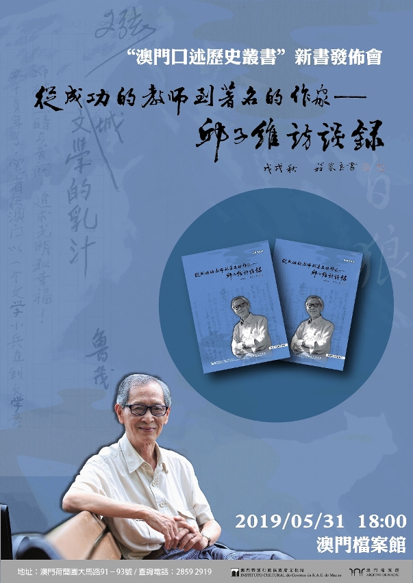 文化局将于5月31日(星期五)下午6时在塔石广场澳门檔案馆举行《从成功的教师到着名的作家──邱子维访谈录》新书发布会,介绍新书内容,欢迎公众参与。