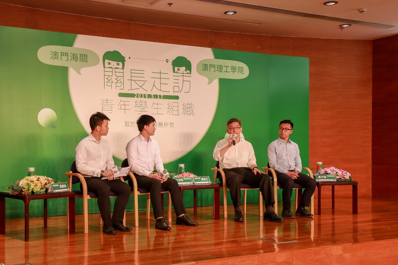活动当日,在理工学院严肇基院长的陪同下,黄有力关长及一众海关人员首先到学院的学生会活动中心、中葡英机器翻译联合实验室和资讯廊参观,了解学生组织的运作及学院的学术发展情况。其后,双方举行座谈会,理工学院学生会代表介绍学生会的组织架构、文娱活动和学术交流等资讯;黄有力关长则以「敢于突破.发展所长」为主题,与一众参与者就海关工作、政策措施、生涯规划等议题进行探讨和交换意见。