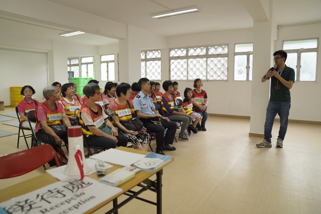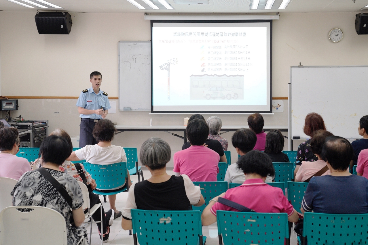 台风季节将至,为进一步加强市民对“台风期间风暴潮低洼地区疏散撤离计划”的认识,提升大众的防灾避险意识,于2019年5月28日下午,消防局联同社会工作局,透过向市民公开报名形式,于澳门街总社区服务大楼举行“台风期间风暴潮低洼地区疏散撤离计划”讲座,向市民讲解有关计划内容、注意事项、以及防灾工作,及后进行演习撤离到避险中心,合共有约30名居民参与。