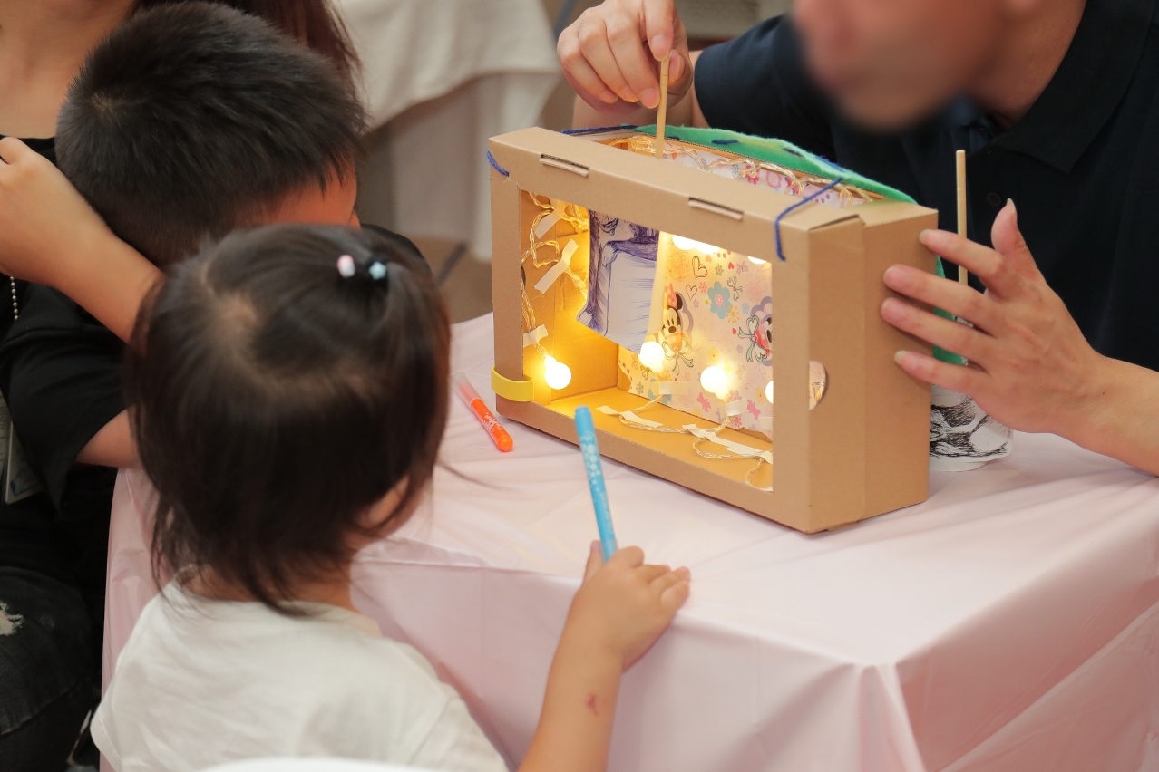 活动中,一众家团首先参与了互动游戏,温情洋溢,气氛热闹。随后,局方特意安排在囚人与子女参与别开生面的“故事绘本盒”互动环节,以“爱•共学”为核心讯息,让在囚人及其子女一同学习,共同成长。各家团按照预先挑选的故事绘本,现场利用基本的文具和材料,携手制作“故事绘本盒”和故事人物的小偶。完成制作后,在囚父母一边操作小偶,一边讲述故事,以更立体和生动的方式向子女演绎故事内容。子女们都觉得故事形式很有趣,父母牵着子女一起移动小偶,大手牵着小手的场面,温馨感人。