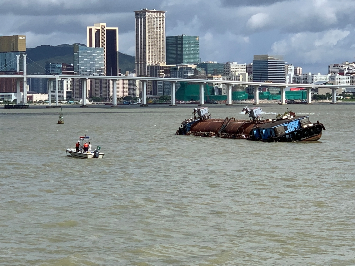 今日早上八时十分,海事及水务局船舶交通管理中心接报,两艘货船“新鸿翔3X”和“金沙机88XX”于氹仔客运码头以北的一段往内港航道附近发生碰撞,两艘船的船员均没有受伤,“金沙机88XX”入水倾侧。海事及水务局接报后即时联同海关派出船只前往现场救援。